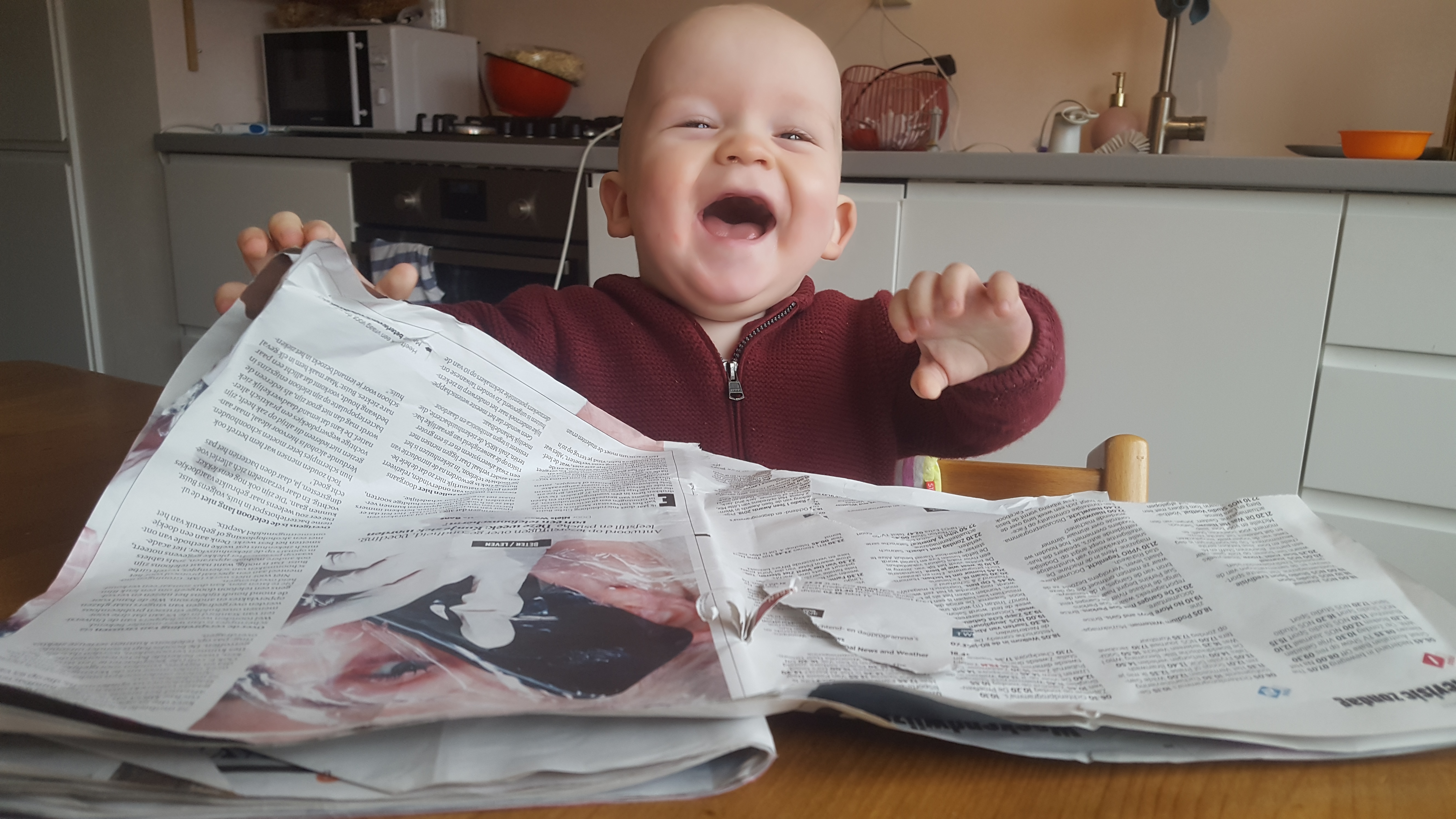 Groeien bedoel ik ook in karakter en persoonlijkheid: als een rupsje dat ons al af en toe een kleur toont van de vlinder die hij ooit zal worden; als een flash forward naar de mens die in je zit verscholen. Zo vertelde de crècheleidster ons vorige week dat er een klein meisje van een ander klasje werkelijk de hele dag continu huilt. Wanneer alle kinderen buiten spelen, is er telkens één enkel mensje dat naast het huilertje gaat zitten om haar met zachte verbazing aan te kijken: meneerke Stoop. In mijn reactie kom ik bij dergelijk zoets vaak niet verder dan: ‘Ooooh, mijn hart, mijn hart!’ Ons ouderschap en jouw ontwikkeling lijken de laatste tijd haasje over te doen. Telkens als jij een sprongetje maakt, trachten wij een aanloop te nemen om weer net wat verder over je heen te springen. Jouw sprongetjes wekken bij ons vaak gefronste wenkbrauwen en verbaasde geluiden op die men eerder zou verwachten bij onopgeloste mathematische paradoxen. Huuuuuhhh?? Je zit immers in een fase waar je al veel begrijpt, maar je je nog niet verbaal kunt uitdrukken. We proberen dan jouw tekens, gebaren en je русскийl te ontcijferen om je weer bij te benen en je hopelijk een stapje voor te zijn. Aan de gangdeur gaan staan en naar boven wijzen, betekent natuurlijk ‘ik wil gaan slapen’. (niet zo heel veel verschil met een hondje dat aan de voordeur draait en kwispelt om te gaan wandelen.) Vager en enigmatischer wordt het telkens tijdens het avondeten: de ene keer pik je met microscopische precisie enkel de champignons van je bord en laat je de 50 tinten groen links liggen, de volgende keer zie je een champignon en kogelstoot je die richting keukenvloer. Dan moeten ik en je mama weer haasje over doen met je nieuwste rariteit en detecteren hoe we dit kunnen interpreteren en oplossen. Wat na empirisch onderzoek telkenmale werkt, is gedroogde uitjes of parmezan over je eten strooien. Dan ga je terug met volle goesting aan de slag. ‘Maar dat is toch ongezond!?’ hoor ik de dieetpolitie al digitaal roepen. De eerste maal krijg je effectief een beetje om je smulmotor terug in gang te zetten, de tweede en derde keer doen we alsof. Dus als iemand ons ooit door het keukenraam met z’n drietjes ziet zitten en niet begrijpt waarom we uitjes strooien met het deksel op de pot, weet dan: opvoeden is psychologische oorlogvoering.