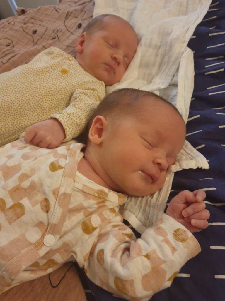 jullie waren nooit nooit. Zo lijkt het wel. Het idee dat we nu enkel een eenling zouden hebben, klinkt even absurd als dat eerste nieuws over twee vruchtjes. De schok na die eerste echo (mama begon ongecontroleerd te schaterlachen telkens onderbroken door een ‘oh nee’ en ik zat als een sneeuwpop door het raam naar buiten te staren waar ik al mijn boeken door de lucht zag vliegen) was al verzacht tijdens de zwangerschap en is nu gestrand én weggespoeld door de afgelopen vijf weken waarin jullie slapen en drinken en leven alsof jullie leven ervan afhangt. En dat gaat zo goed! Als een verwittigd man er twee waard is, zijn papa en mama met honderden. Zovele eerste zware reacties en ongevraagde adviezen: ‘Oei, een tweeling: dat wordt pittig! ‘Ocharme’ ‘Double trouble’, ‘Probeer wat bij te slapen nu het nog kan’, ‘Tot over vijf jaar!’ Los van het karige psychologische licht dat in dergelijke opmerkingen schemert, zijn de voorspellingen tot nu toe te negatief gebleken. Code Rood van nachten waarbij beide baby’s elkaar afwisselen met huilbuien en Louie die een potje mee komt janken, werd nooit van kracht -Nationaal Rampenplan mede ingedommeld. Want waar wij uitputting hadden verwacht, is er enkel een normale vermoeidheid. Waar we chaos vreesden, is er hoogstens drukte. We zoeken daarbij geleidelijk een gezonde balans tussen georganiseerd en organisch. Terwijl wij van acht naar zes voedingen zijn afgeslankt, zijn jullie gestaag gegroeid. Wanneer eenpersoonsmelkfabriek mama kolft (1,5 liter per dag!), geef ik jullie tegelijk de fles. Het is verbijsterend hoeveel je kan met een paar handen, knieën en een half dozijn kussens.