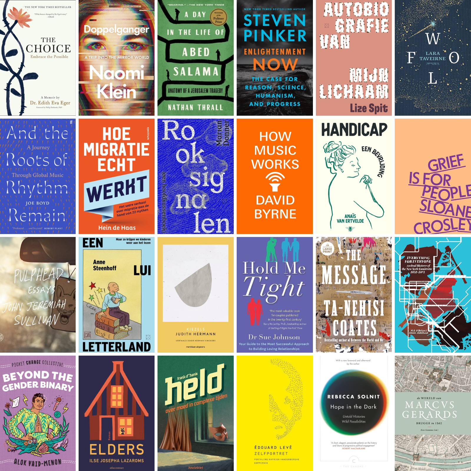 Bewust koos ik hierboven voor een uitgebreide selectie en voor de term ‘belangwekkend’. In het horribele wereldjaar 2024 – waarin ik en vele anderen gebukt liepen onder ‘wereldleedleed’- vouwde ik de waaier van mens-zijn nog breder open. Ik wil immers kunnen invoelen wat mensen van een andersoortig pluimage en met andere (of vooral meer) hindernissen op hun levenspad ervaren. Ik ben slechts ik en de wereld is zo groot en divers. Hoezo zou ik dan niet handig gebruik maken van zoveel mogelijk andere ikken om een waarachtiger en waardevoller panorama te verkrijgen? Zo ervaarde ik afgelopen jaar in bepaalde mate hoe het voelt om een handicap te hebben, om een broer te hebben gehad die zichzelf doodde, hoe het opgroeien in een disfunctioneel gezin zijn sporen nalaat, hoe het is om non-binair te zijn, hoe je in godsnaam een verblijf in Auschwitz een plaats in je verdere leven geeft, hoe het is om als Palestijn op de Westelijke Jordaanoever dagdagelijks geterroriseerd te worden door Israëli. Mijn waaier reikte van non-conformist Naomi Klein tot positivist Steven Pinker en ook op FB trachtte ik wat vaker in rechtste bubbels te vertoeven om te begrijpen hoe we zó verschillend kunnen kijken naar dezelfde wereld. Ik ben er immers van overtuigd dat enkel radicale openheid en een ontembare nieuwsgierigheid naar elkaar een antwoord kan bieden op de sociale en politieke toxiciteit die ons omringt. Mijn goede voornemen voor 2025 is om deze verbinding ook nog meer buíten de boeken en de sociale media aan te gaan.